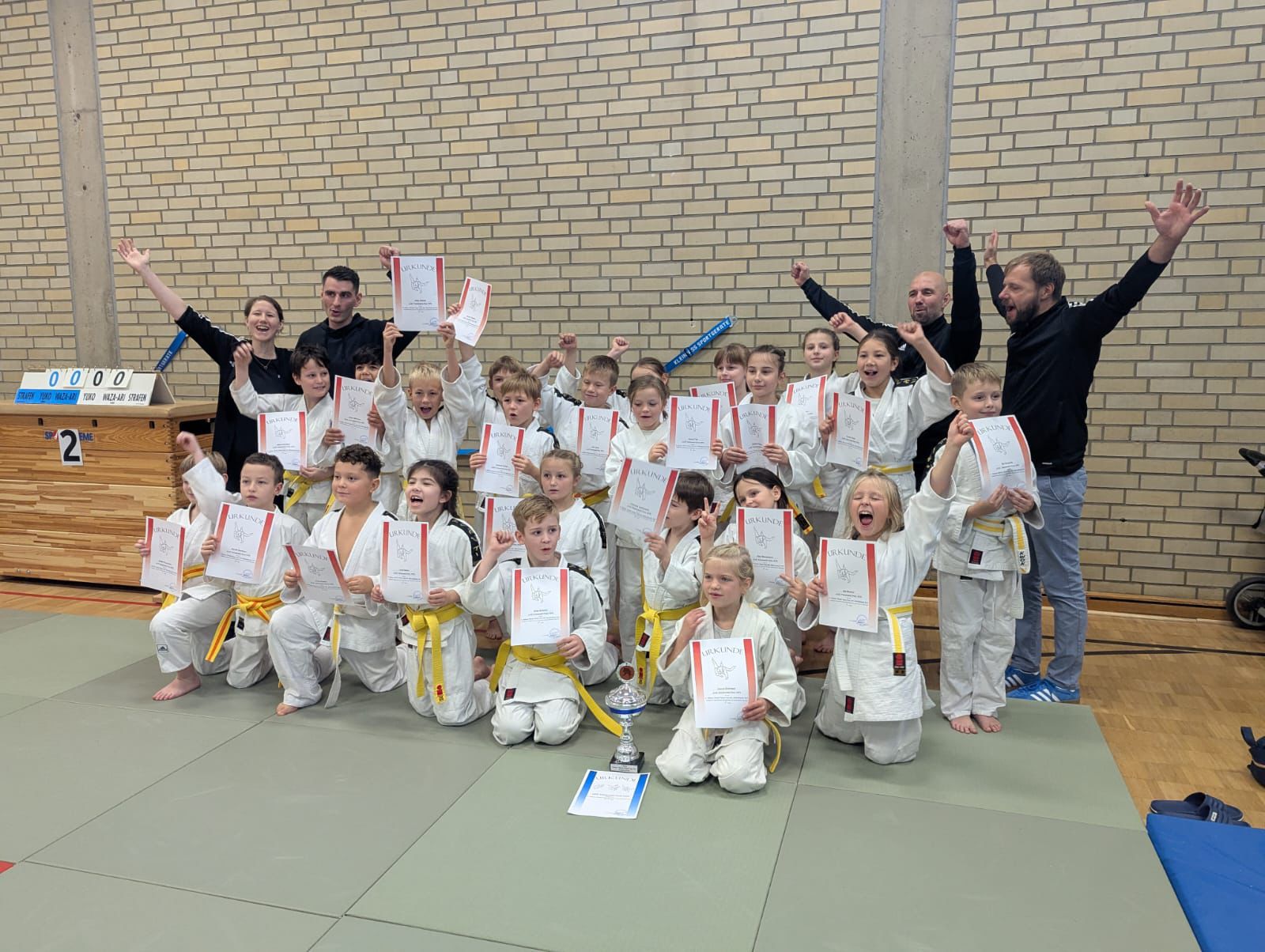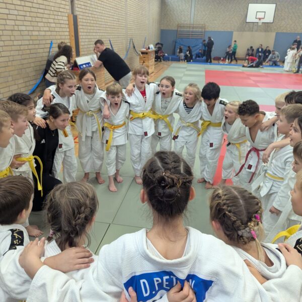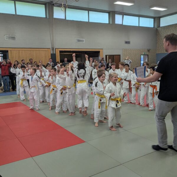 Und der Einsatz zahlte sich aus: Am Ende konnten sich unsere jungen Judoka mit dem 1. Platz belohnen und durften den begehrten Wanderpokal mit nach Hause nehmen! Der Jubel war riesig – bei den Kindern, den Trainer:innen und natürlich auch bei den mitgereisten Eltern.